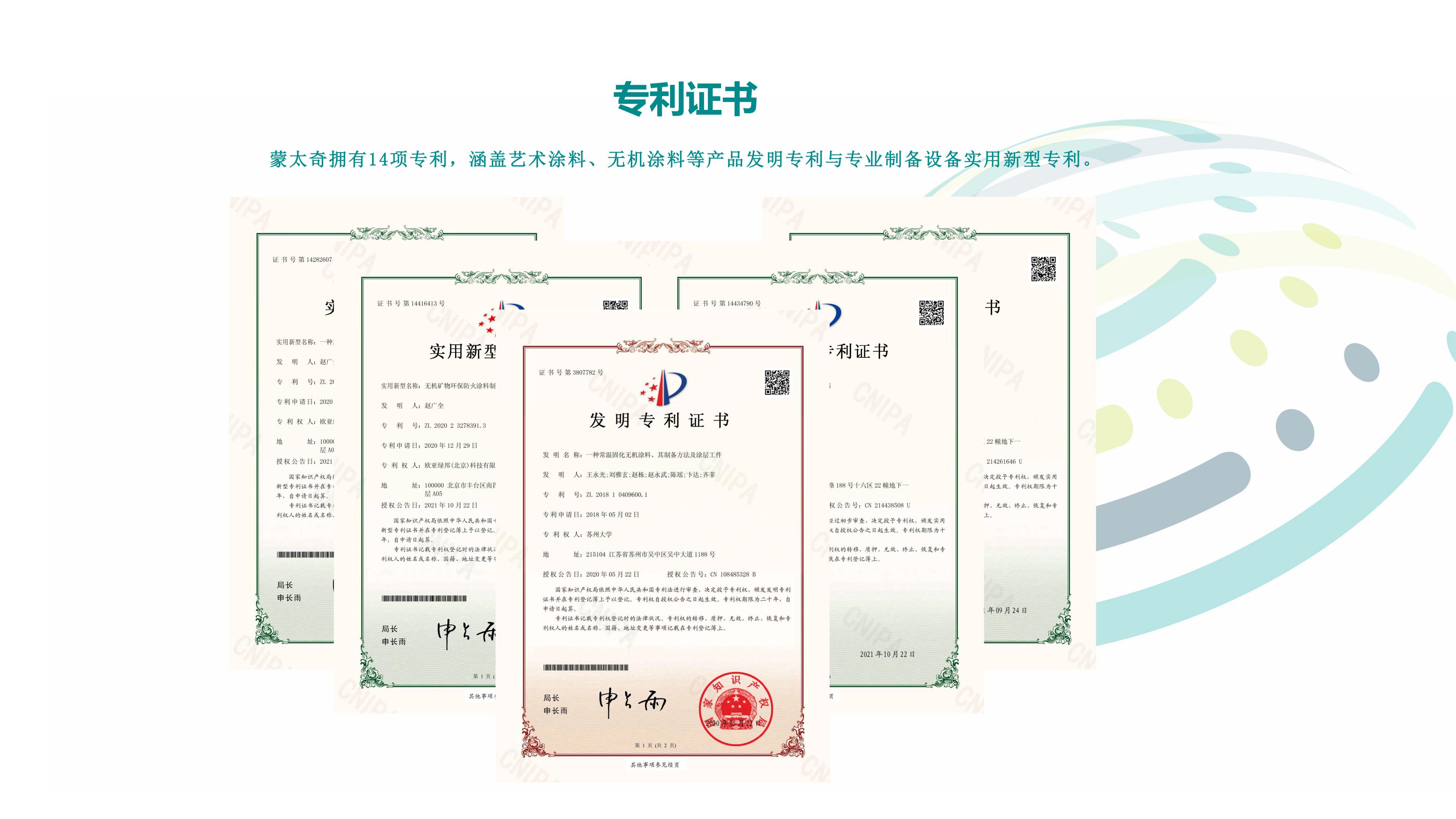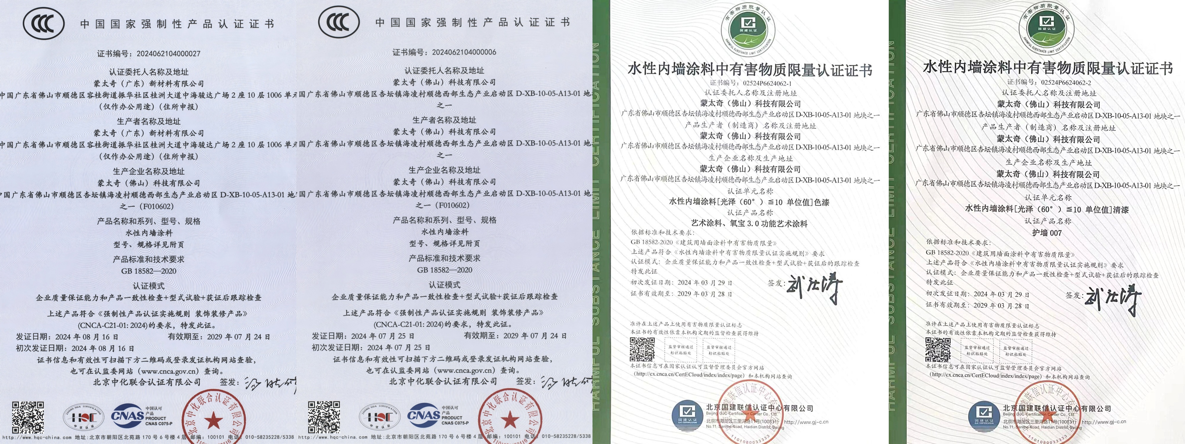 在此專利獲準(zhǔn)前,蒙太奇已擁有14項專利,涵蓋藝術(shù)涂料、無機涂料等產(chǎn)品發(fā)明專利與專業(yè)制備設(shè)備實用新型專利。在嚴(yán)格遵循國家標(biāo)準(zhǔn)、通過基礎(chǔ)認證的基礎(chǔ)上,蒙太奇主動對標(biāo)國際先進水平,成為行業(yè)首批獲得《水性內(nèi)墻涂料中有害物質(zhì)限量認證》及3C強制產(chǎn)品認證的雙資質(zhì)品牌。這些技術(shù)成果與權(quán)威認證的積累,不僅印證了蒙太奇的研發(fā)實力,更為藝術(shù)涂料行業(yè)的標(biāo)準(zhǔn)化建設(shè)添磚加瓦,推動行業(yè)邁向新高度。
