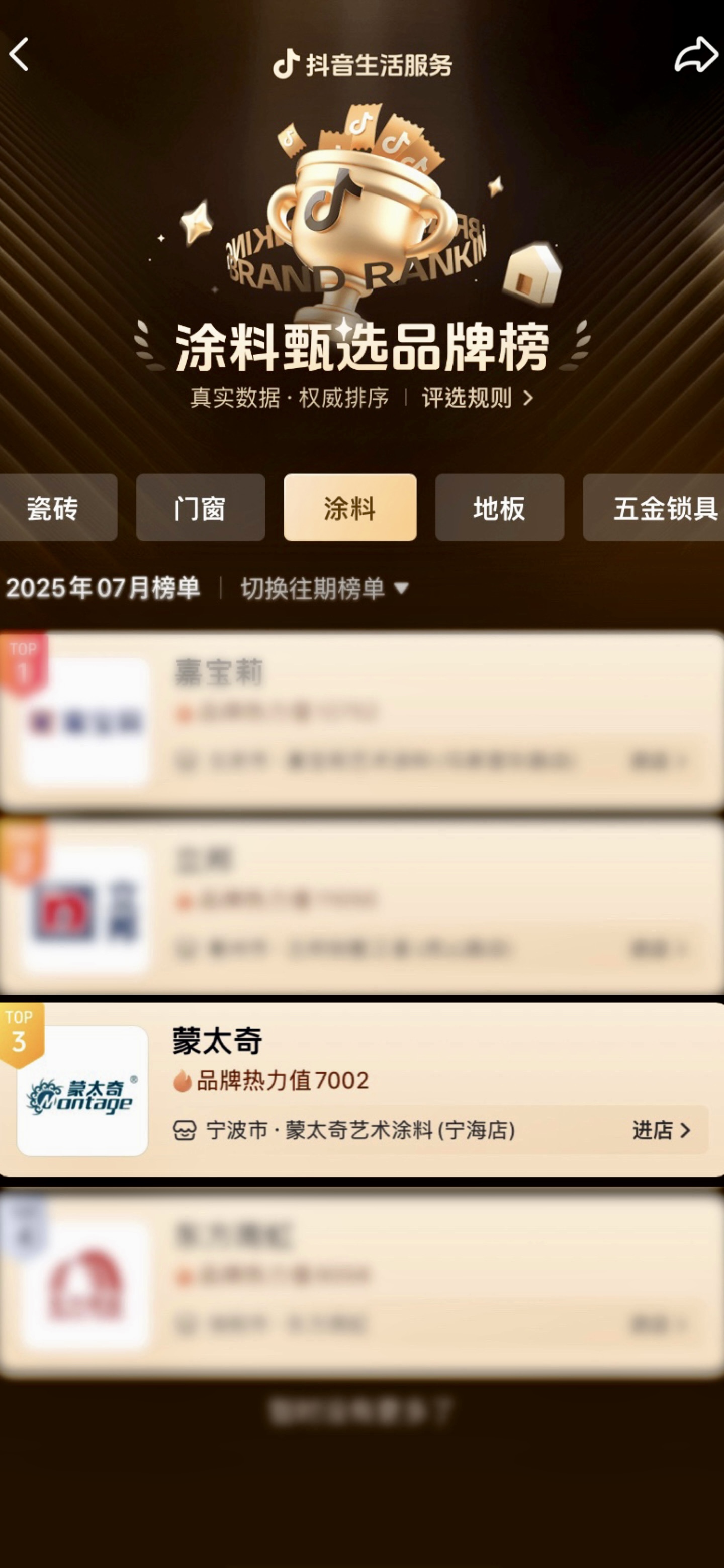近日,抖音生活服務重磅發布行業權威榜單,蒙太奇藝術涂料憑借卓越的產品品質與深厚的消費者口碑,成功榮膺【抖音生活服務·涂料甄選品牌榜TOP3】。這一榮譽不僅是對蒙太奇品牌市場影響力的權威認可,更彰顯了其作為藝術涂料領域創新引領者的強勁實力,為行業樹立了數字化營銷新標桿。