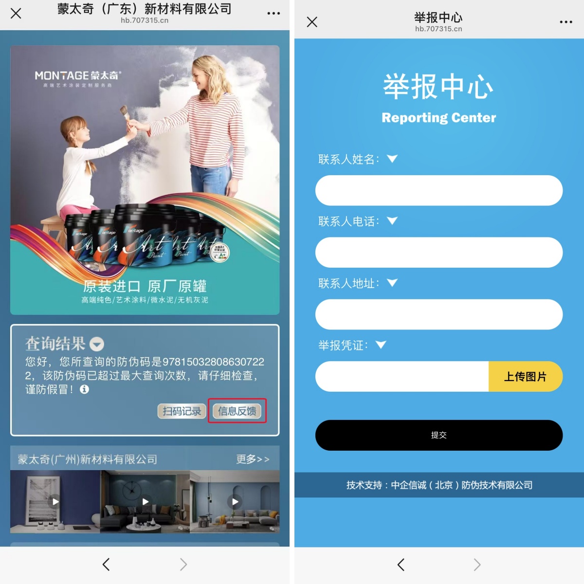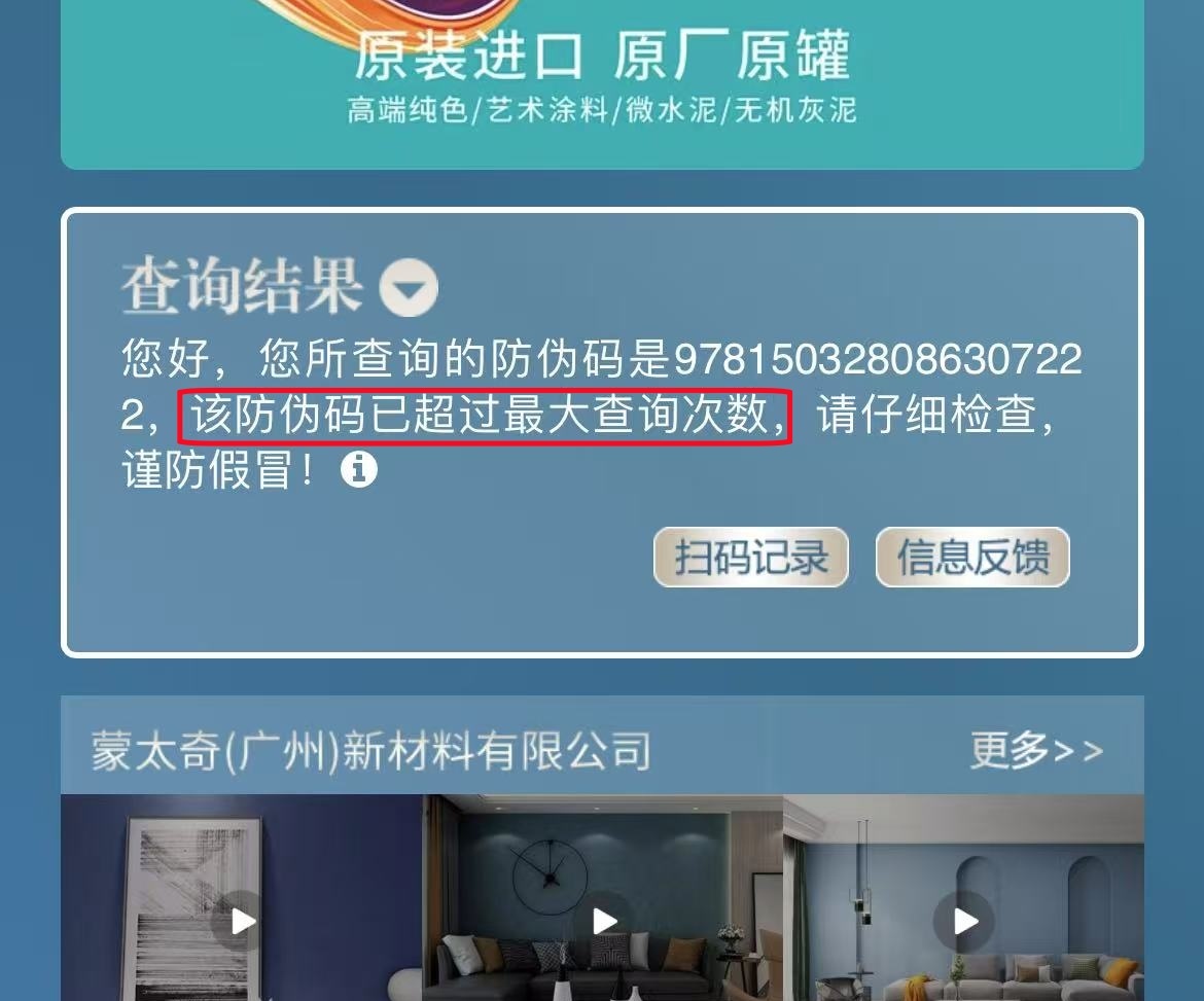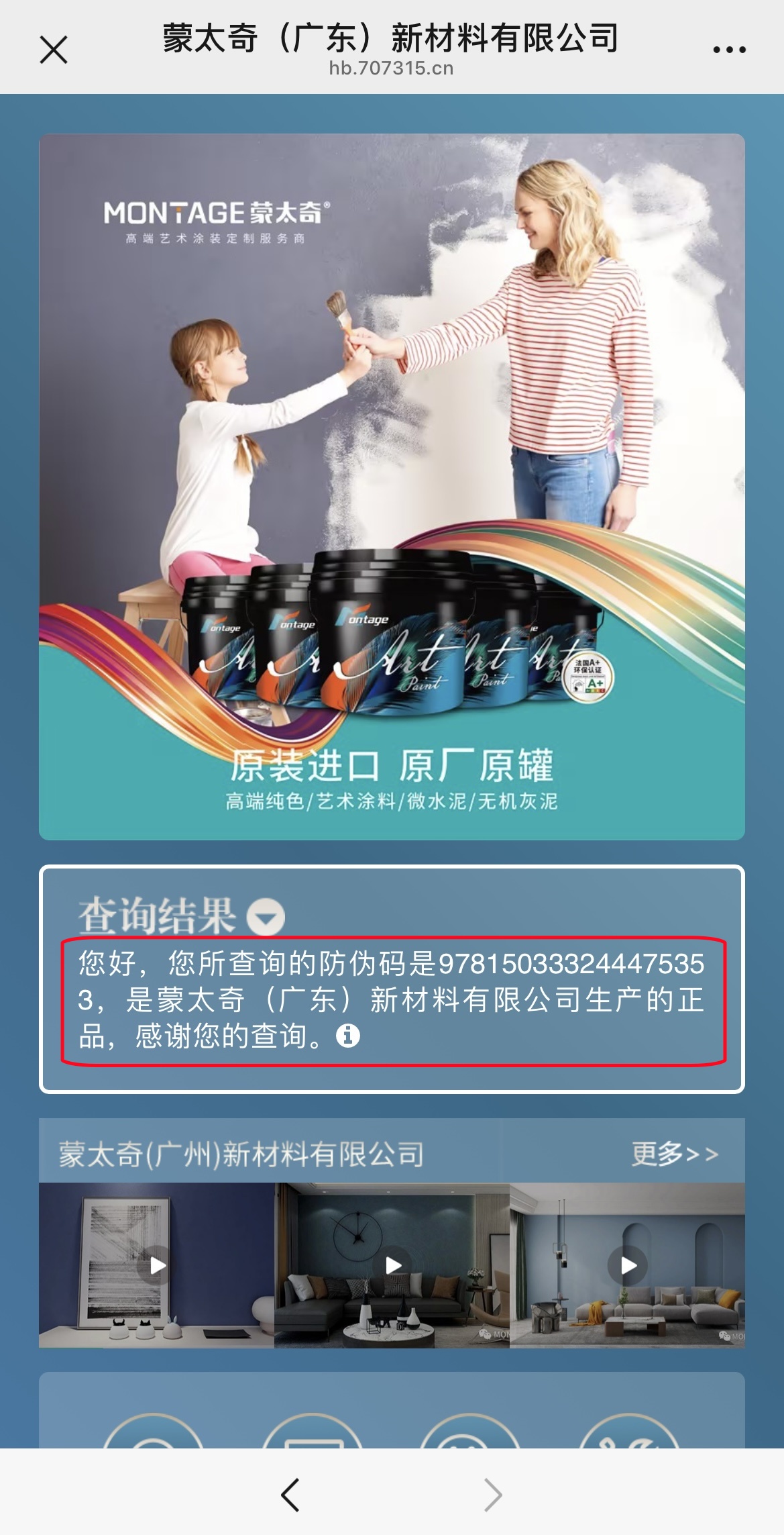若結(jié)果顯示“是蒙太奇(廣東)新材料有限公司生產(chǎn)的正品”,請(qǐng)?jiān)俸藢?duì)查詢結(jié)果顯示的防偽碼與產(chǎn)品包裝上的防偽碼是否一致,若顯示以下信息,則該產(chǎn)品為官方正品。