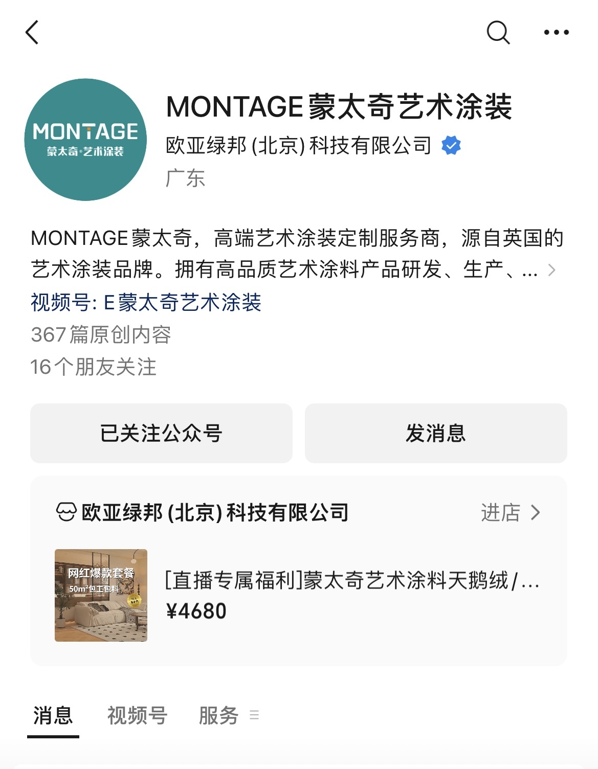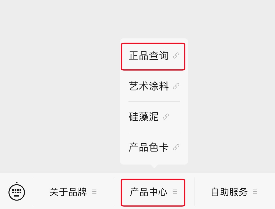 通過(guò)微信客戶端掃描產(chǎn)品包裝側(cè)封處的【官方微信公眾號(hào)二維碼】,對(duì)【MONTAGE蒙太奇藝術(shù)涂裝】官方公眾號(hào)的關(guān)注與綁定。此平臺(tái)為品牌唯一授權(quán)的防偽查詢?nèi)肟凇?/span>