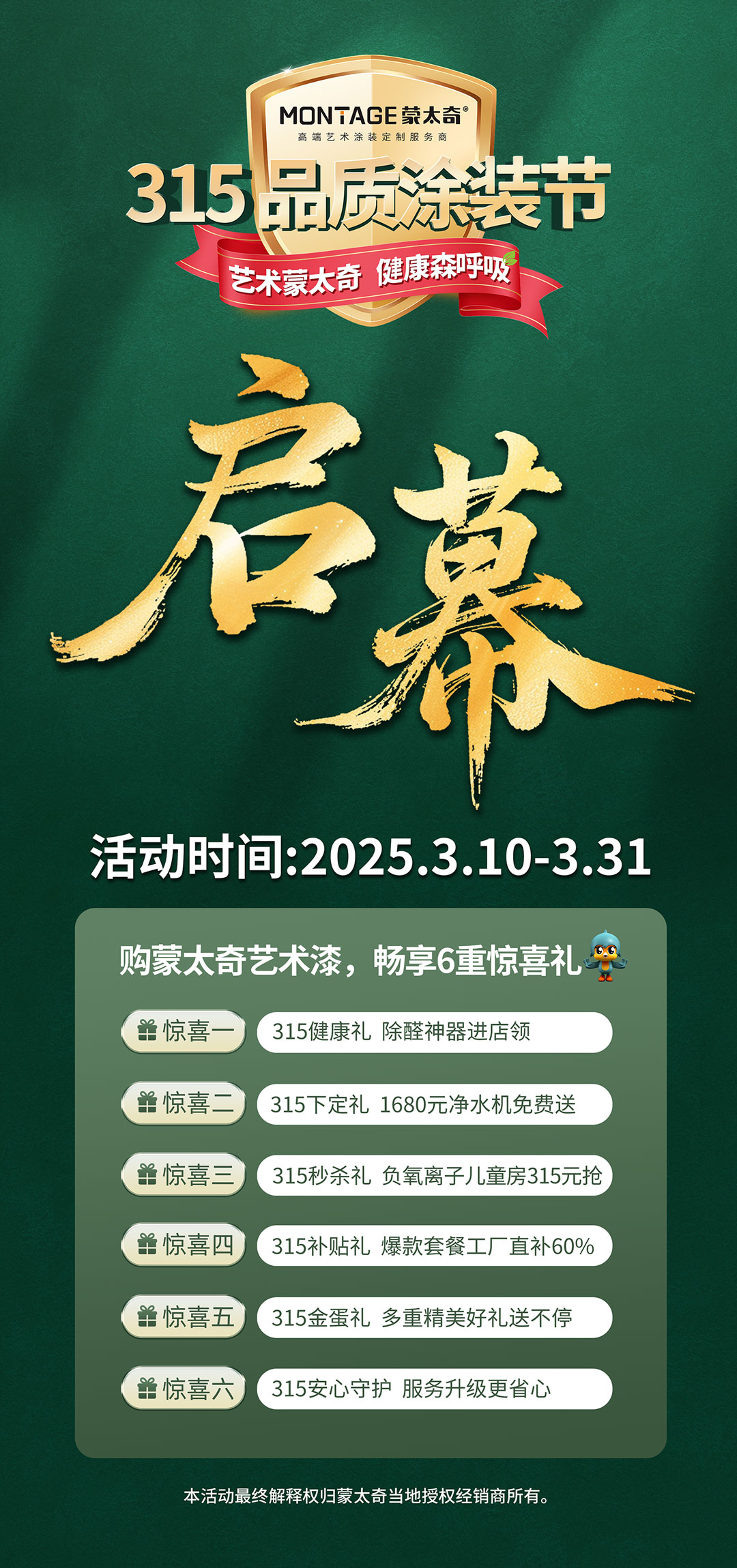 當政策紅利遇上315煥新剛需,蒙太奇于3月10日至31日重磅推出“315品質涂裝節”活動。作為2025年的首波盛惠,總部牽頭聯動全國多家終端門店,為全國消費者帶來前所未有的優惠與驚喜。