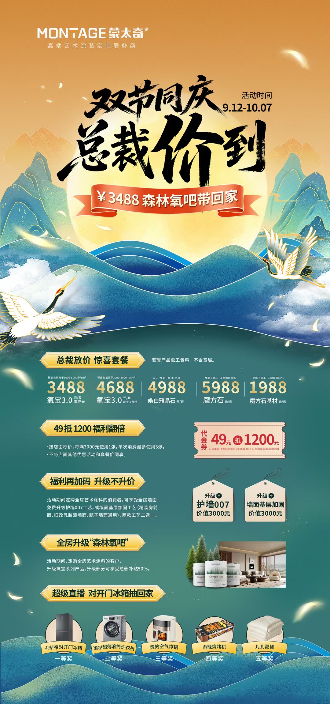 金秋送爽,雙節(jié)同慶。當(dāng)中秋明月邂逅國慶華誕,9月12日至10月7日,蒙太奇藝術(shù)漆“雙節(jié)同慶,總裁'價'到”大促活動火熱來襲!迎中秋、慶國慶,我們特別推出氧寶系列產(chǎn)品升級鉅惠,助您用超值預(yù)算打造綠色森林之家,讓團圓與美好在此相遇,輕松實現(xiàn)一站煥新家。